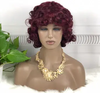 Fringe Double Drawn Wig Human Hair Pixie Curl Wigs 300% Density 16" Wine Color 9