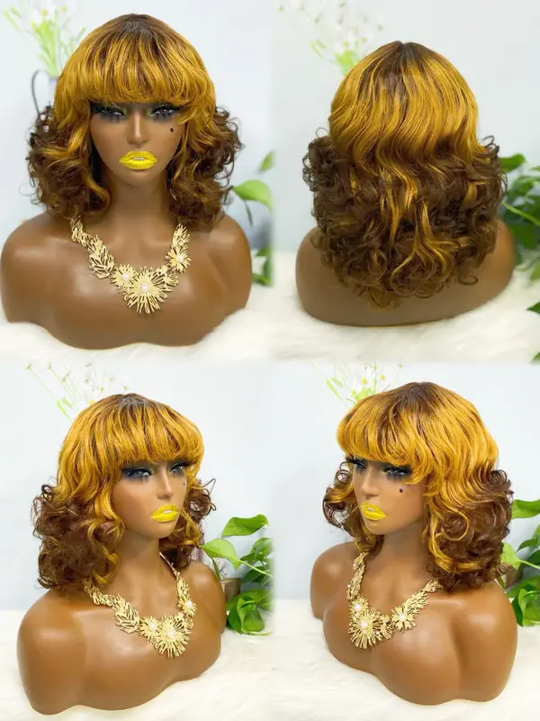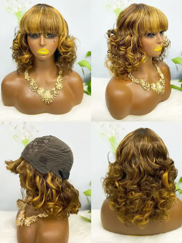 DD Wig Bangs Machine Human Hair Wig Straight Highlight Color P4/27 12inch